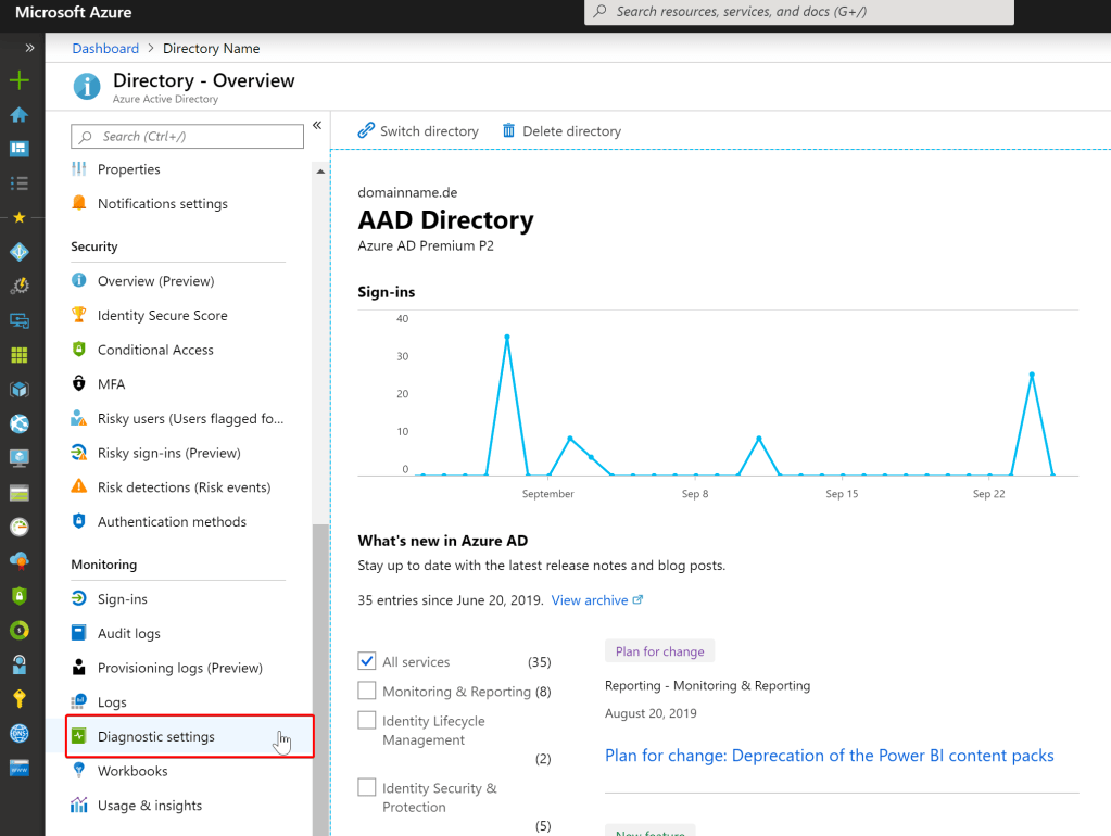 Select Azure Active Directory > Diagnostic settings -> Add diagnostic setting. select Export Settings from the Audit Logs or Sign-ins page to get to the diagnostic settings configuration page. - In the Diagnostic settings menu, select the Send to Log Analytics workspace check box, and then select Configure.